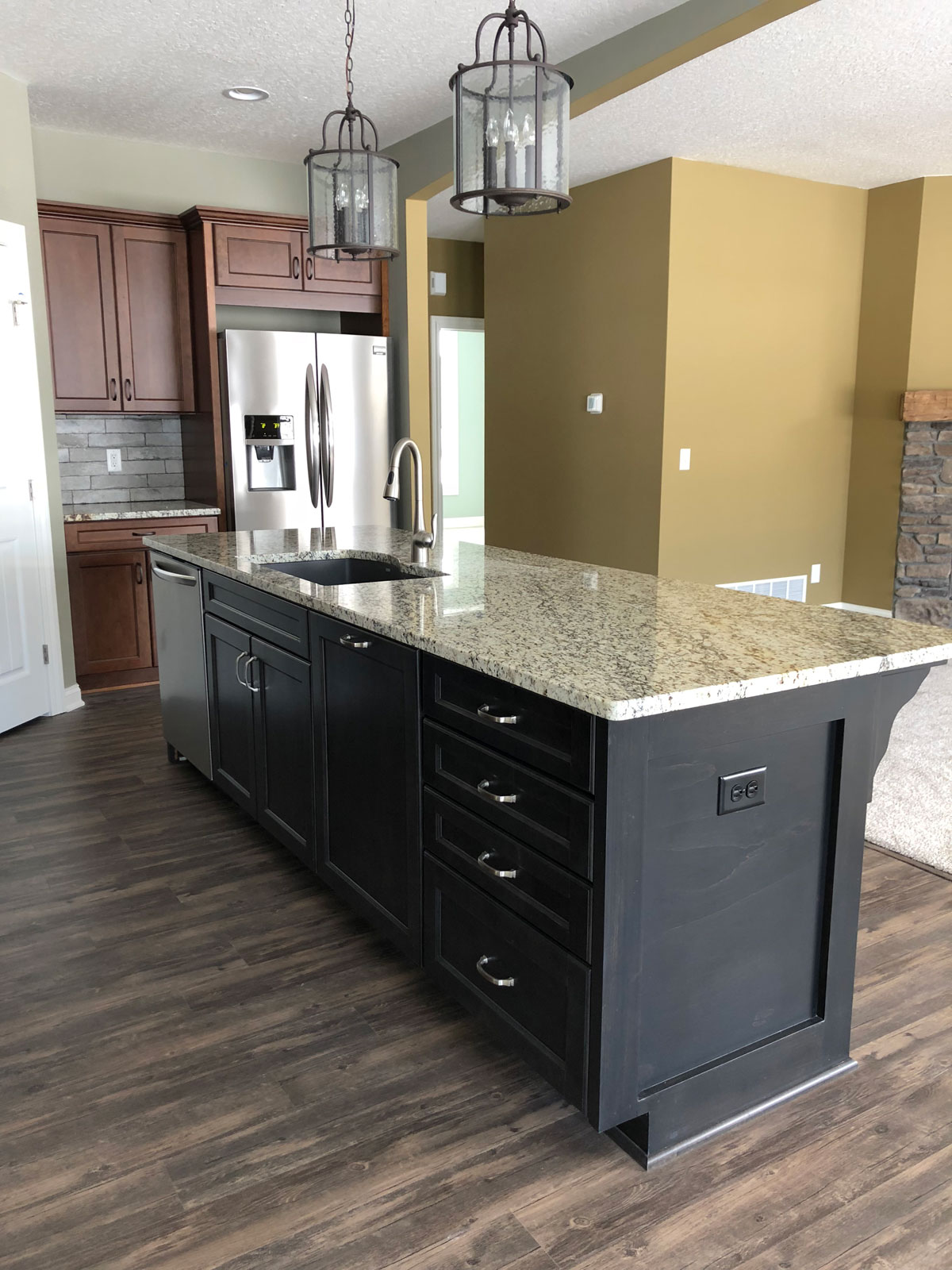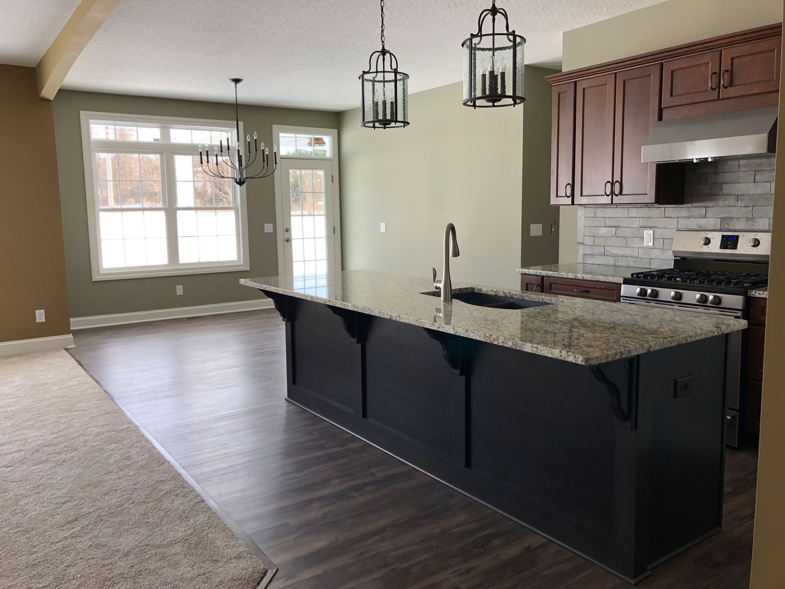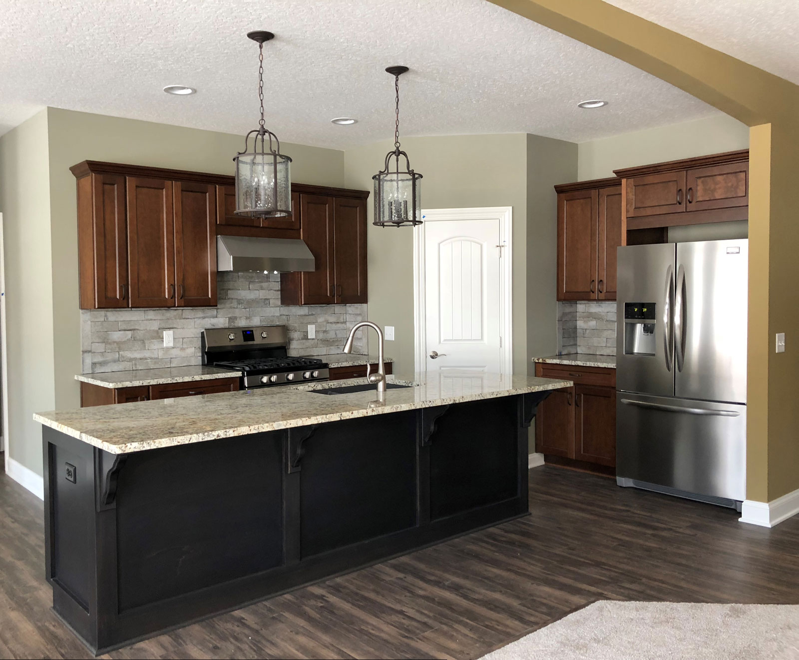 Description: This beautiful ranch home offers a spacious 2-car garage and open concept floor plan. Custom trim work throughout with upgraded flooring, custom cabinets, and solid surface counters. This floor plan has a spacious master retreat with a large walk-in closet. A large covered patio is located off the rear of the house. This home has a combination of stone and siding, with a front covered porch that welcomes you into the home.